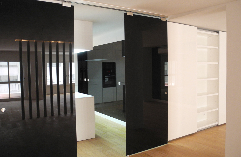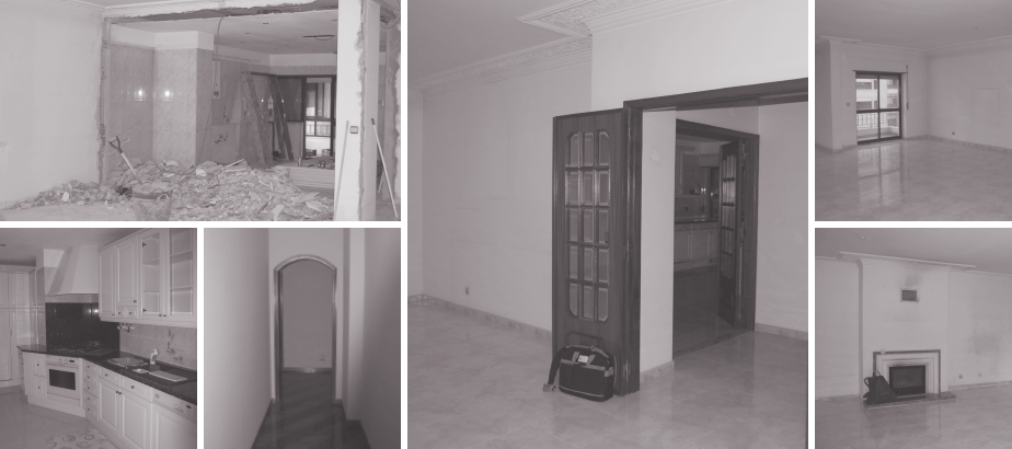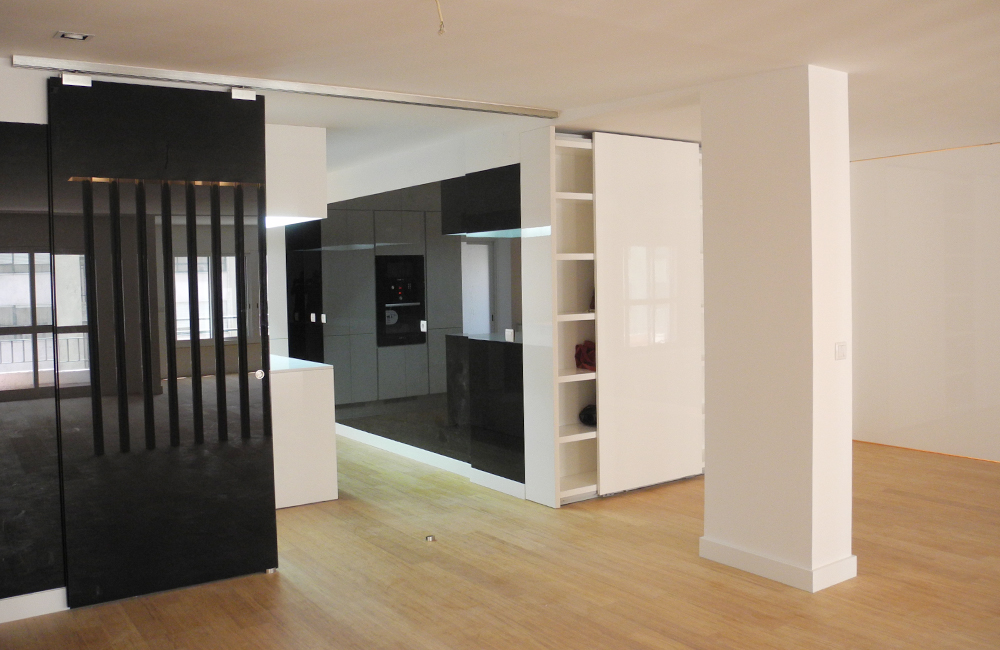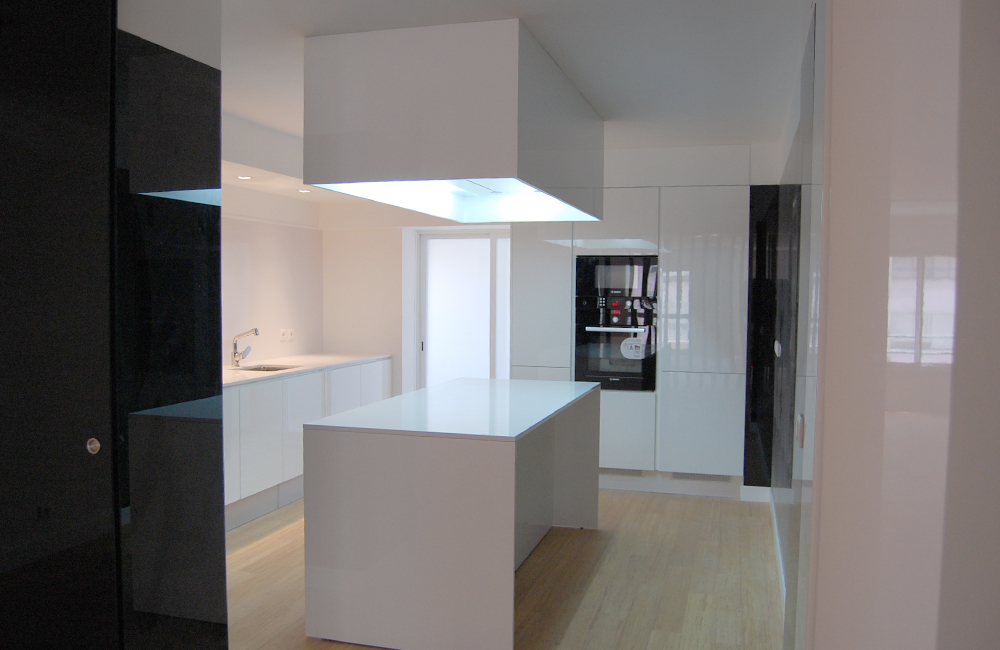 A cozinha foi aberta para a sala e cedeu área à zona social. A arrumação era escassa e pouco funcional e foi projectada para permitir uma distribuição eficiente, discreta e integrada.