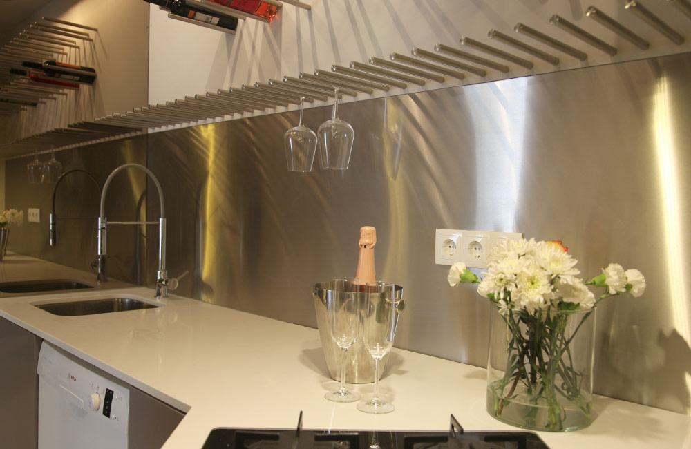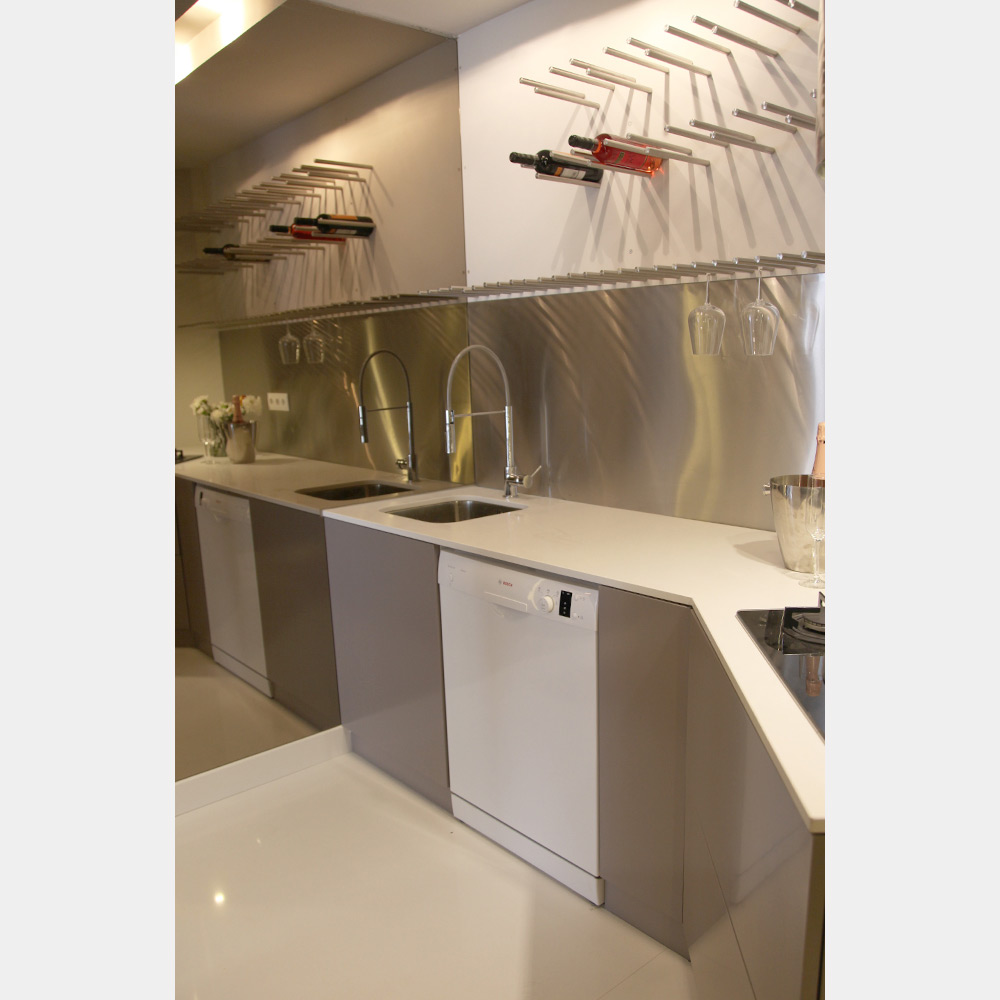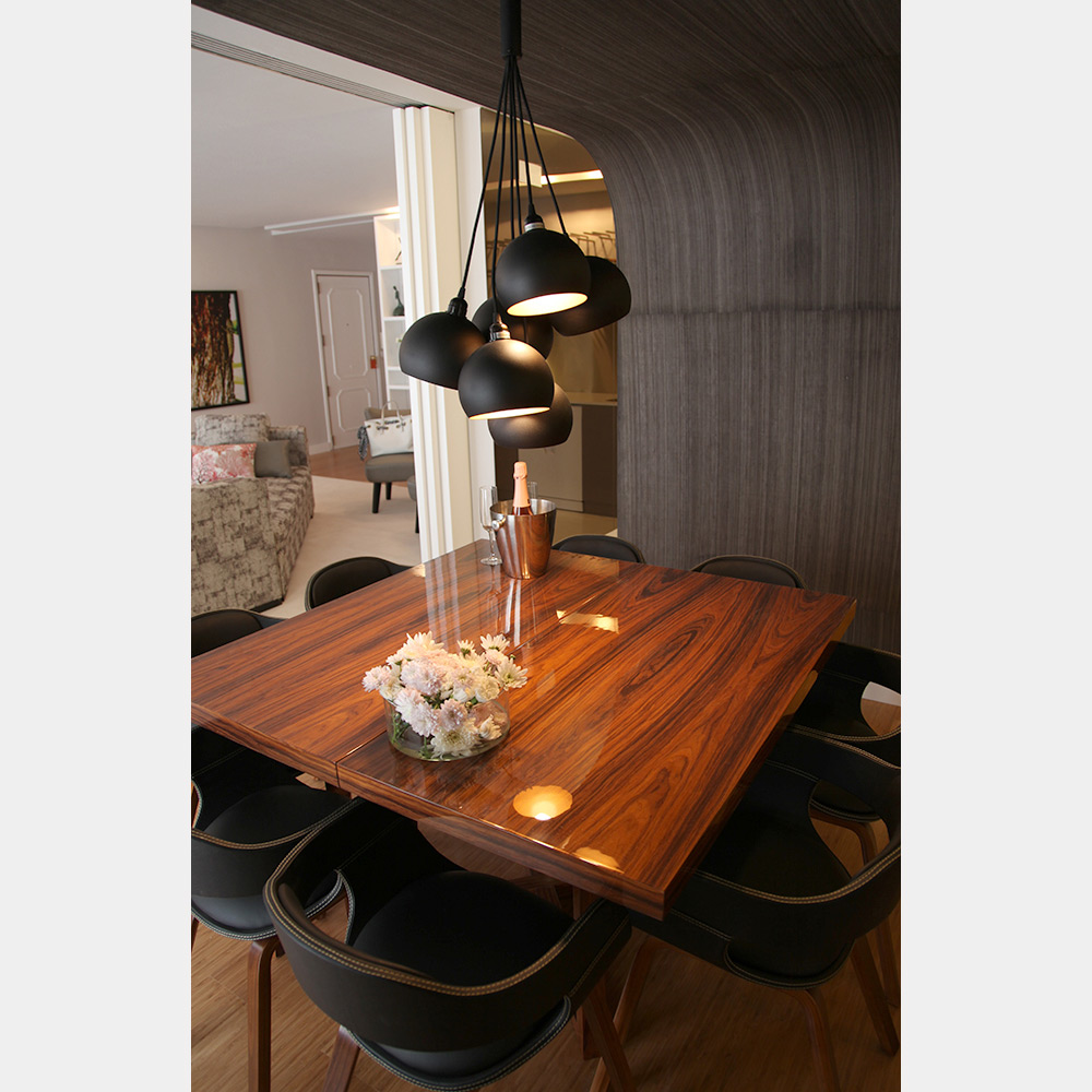 A cozinha foi aberta para a sala e cedeu área à zona social. A arrumação era escassa e pouco funcional e foi projectada para permitir uma distribuição eficiente, discreta e integrada.